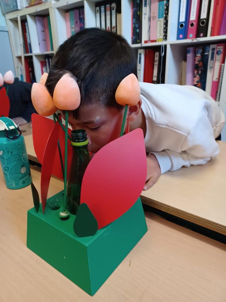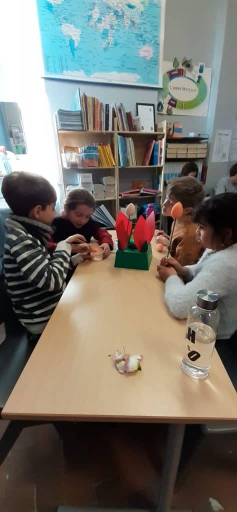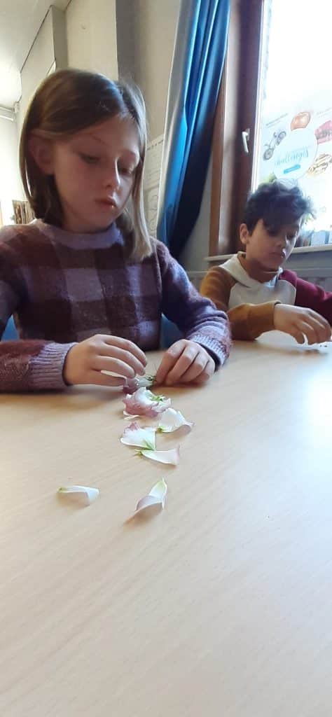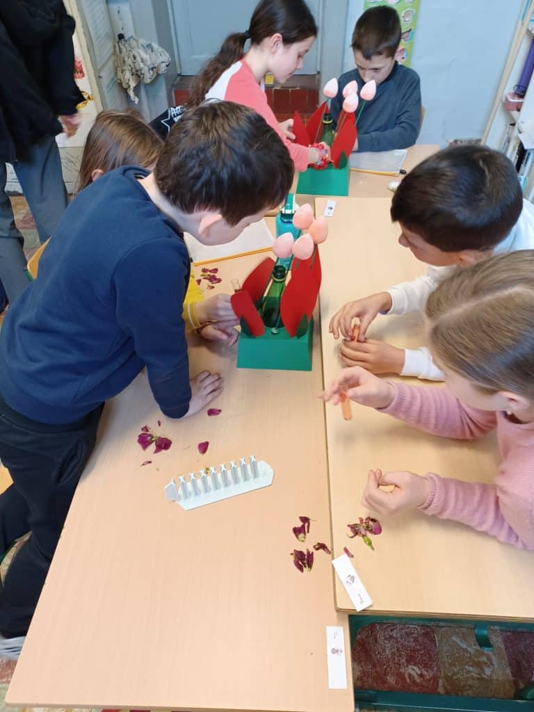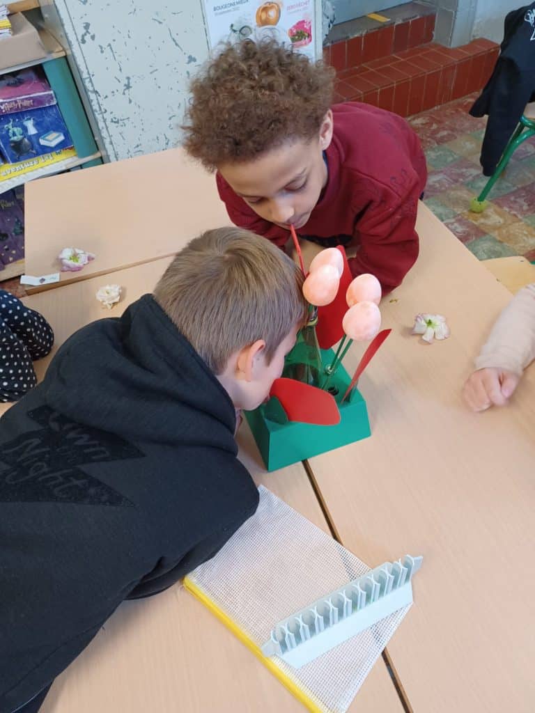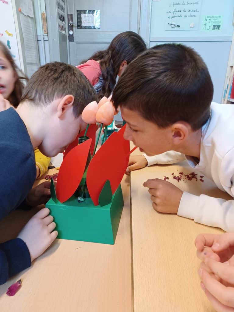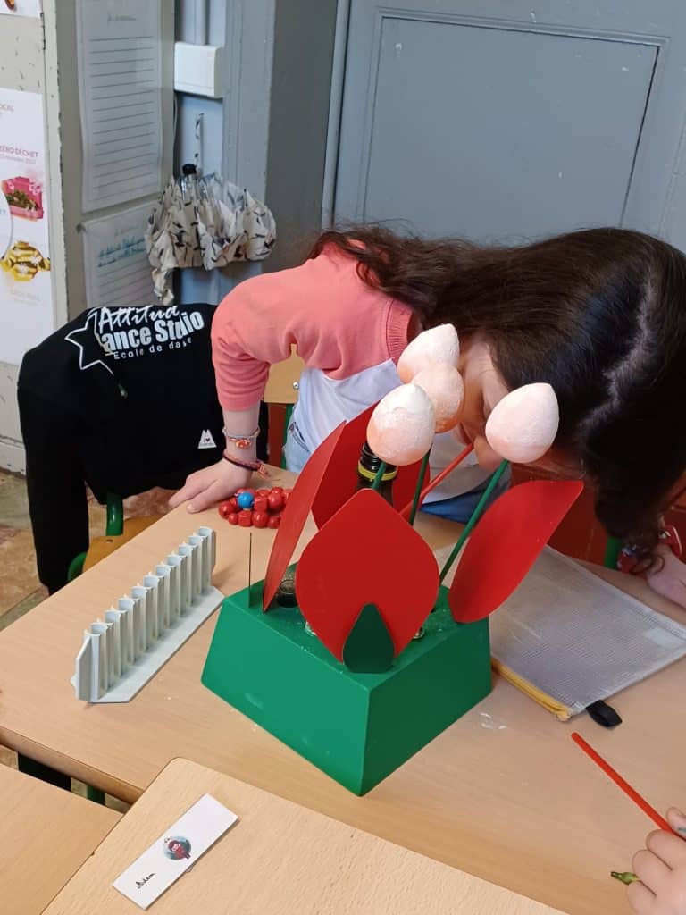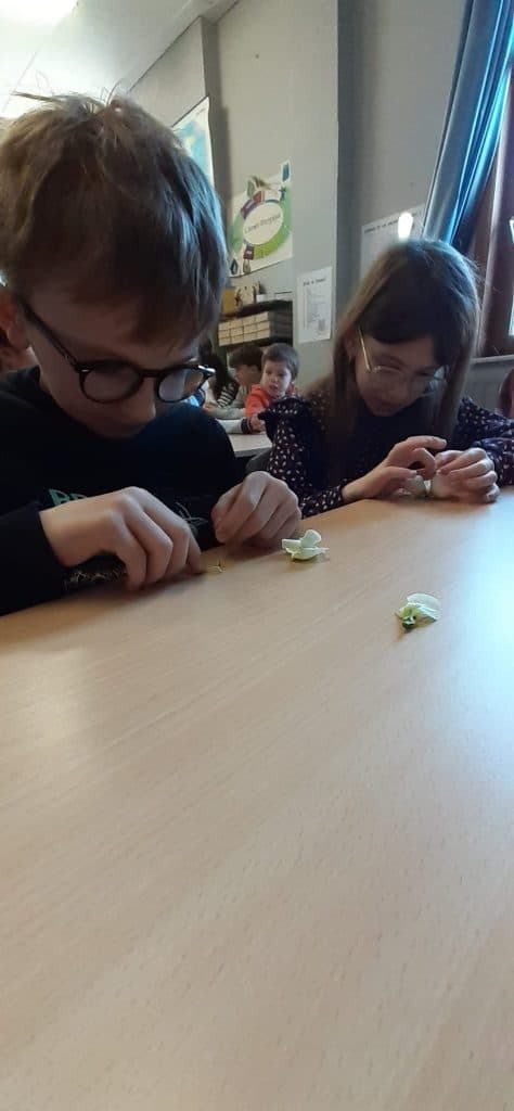 Les enfants ont découvert les différentes parties de la fleur, comment le pollen était transporté de fleur en fleur, ce qu’elles « devenaient » après, en quoi consiste le « travail » des abeilles, …