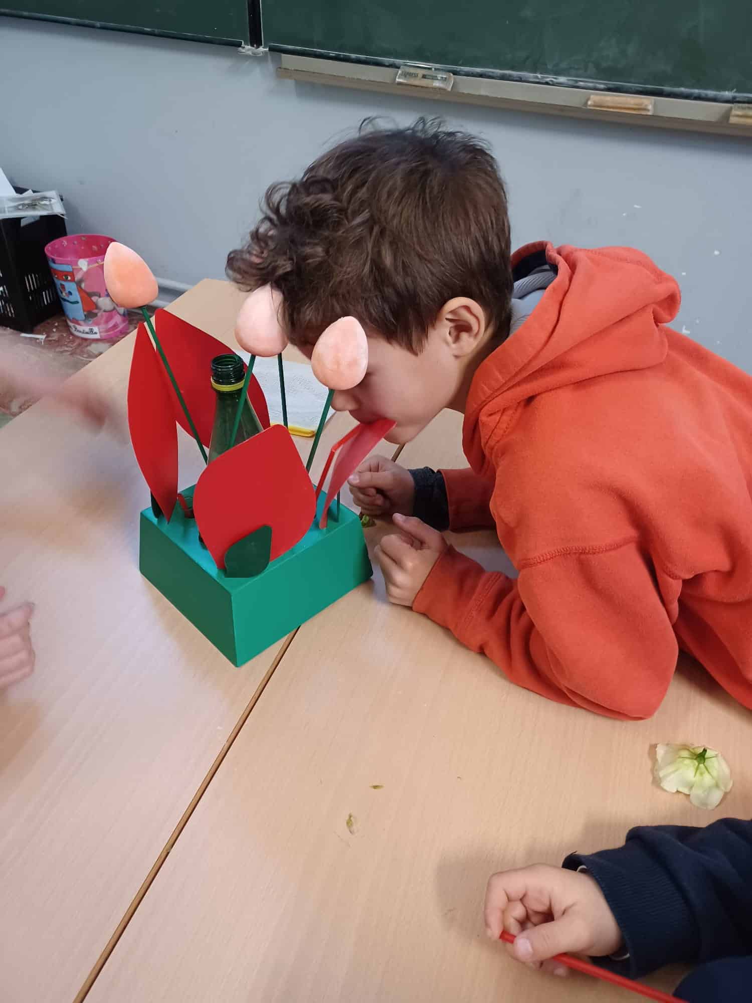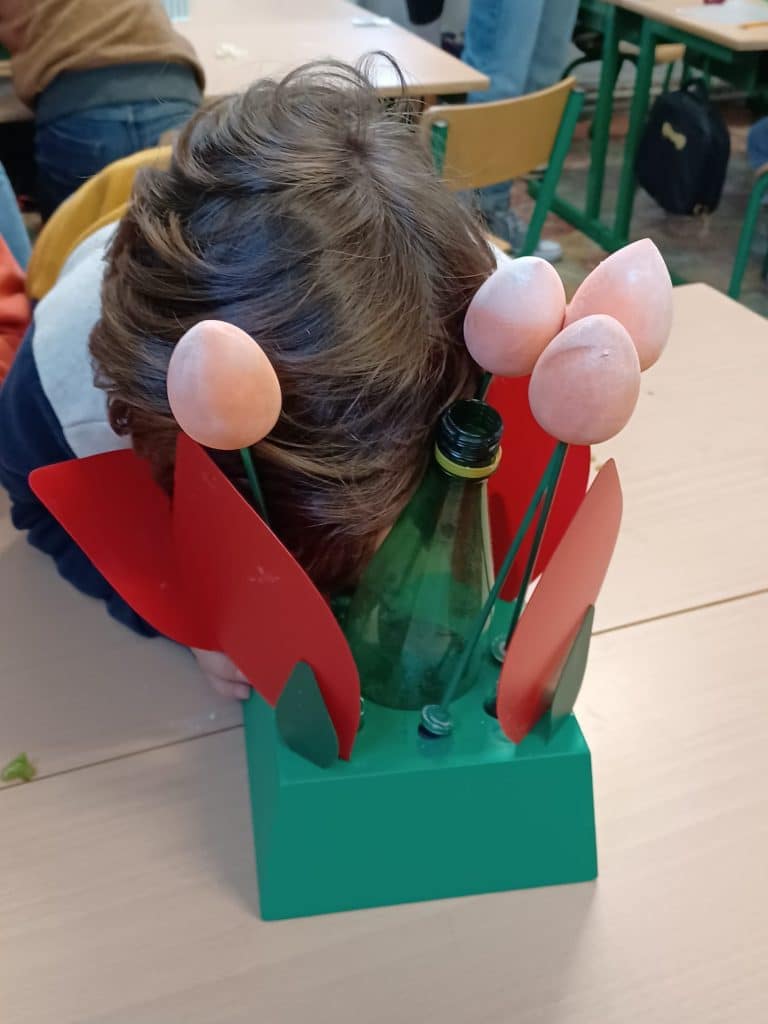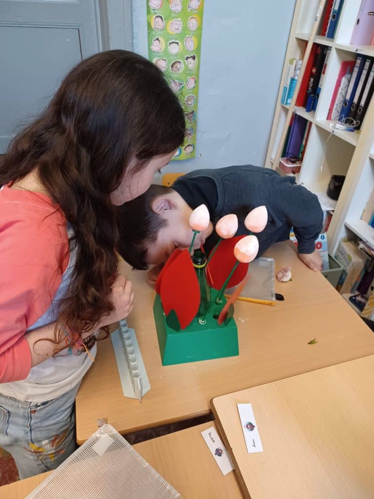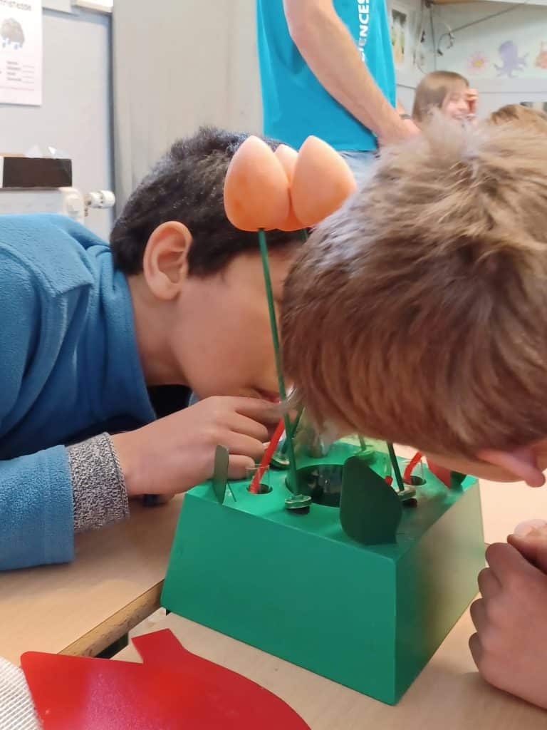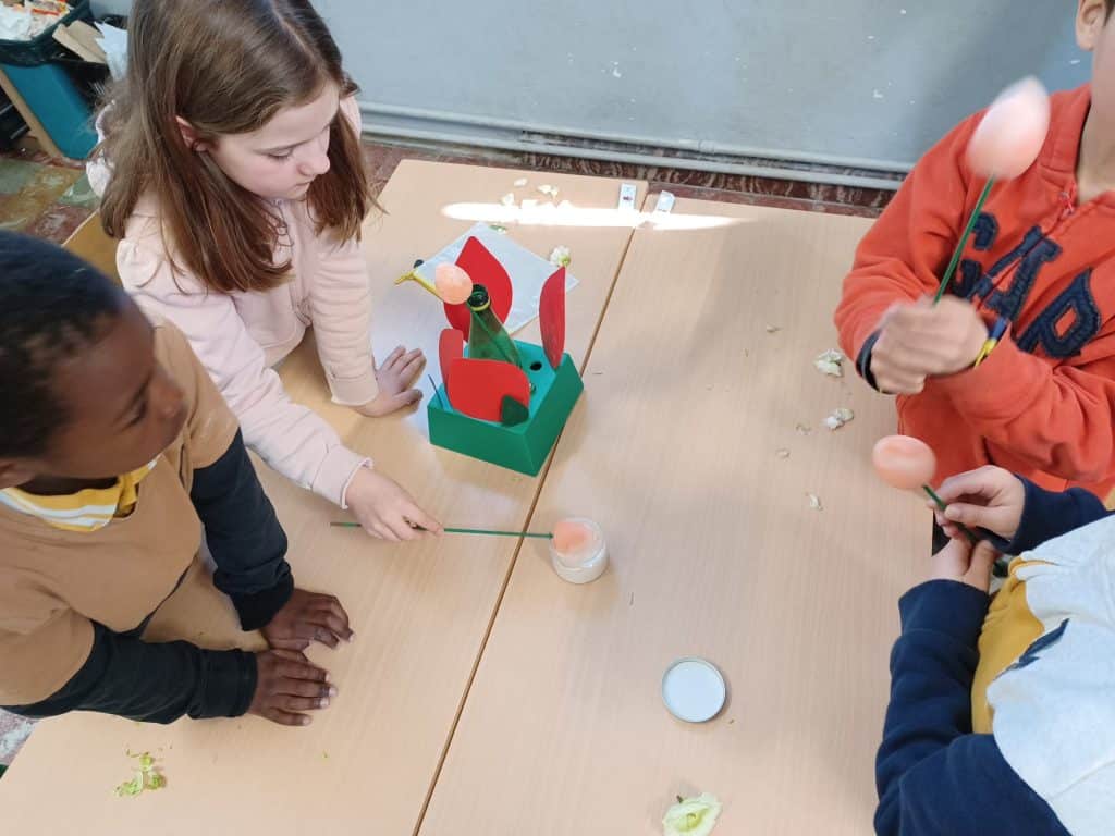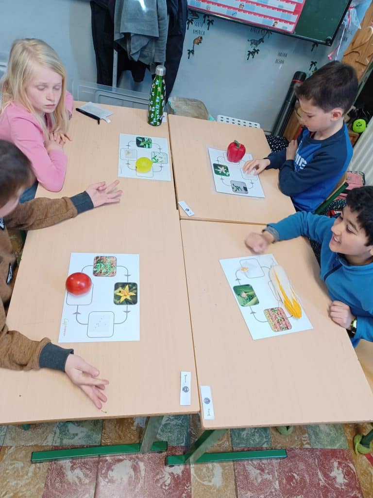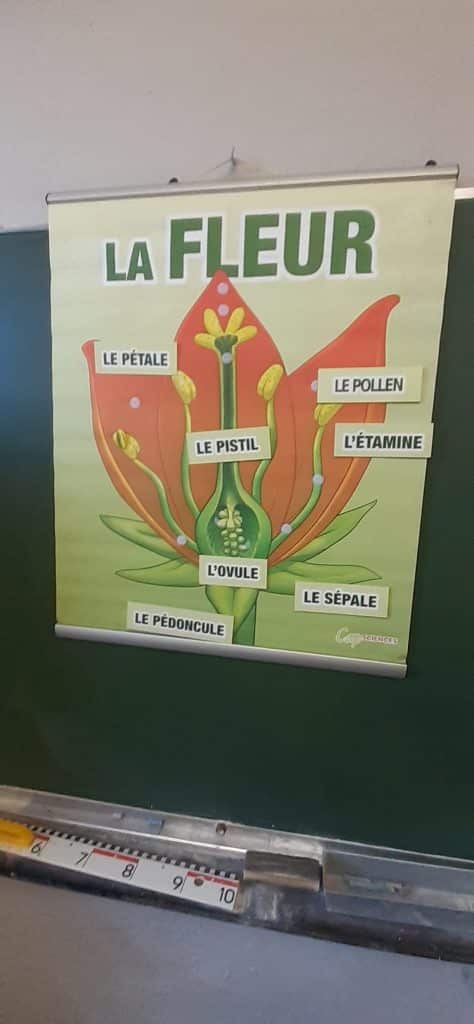 Les enfants ont découvert les différentes parties de la fleur, comment le pollen était transporté de fleur en fleur, ce qu’elles « devenaient » après, en quoi consiste le « travail » des abeilles, …