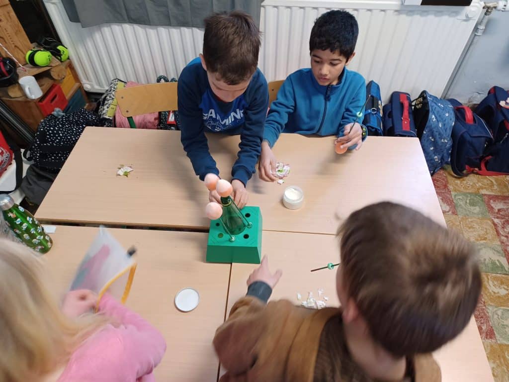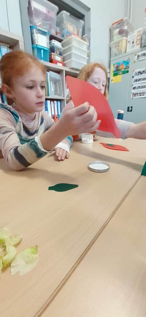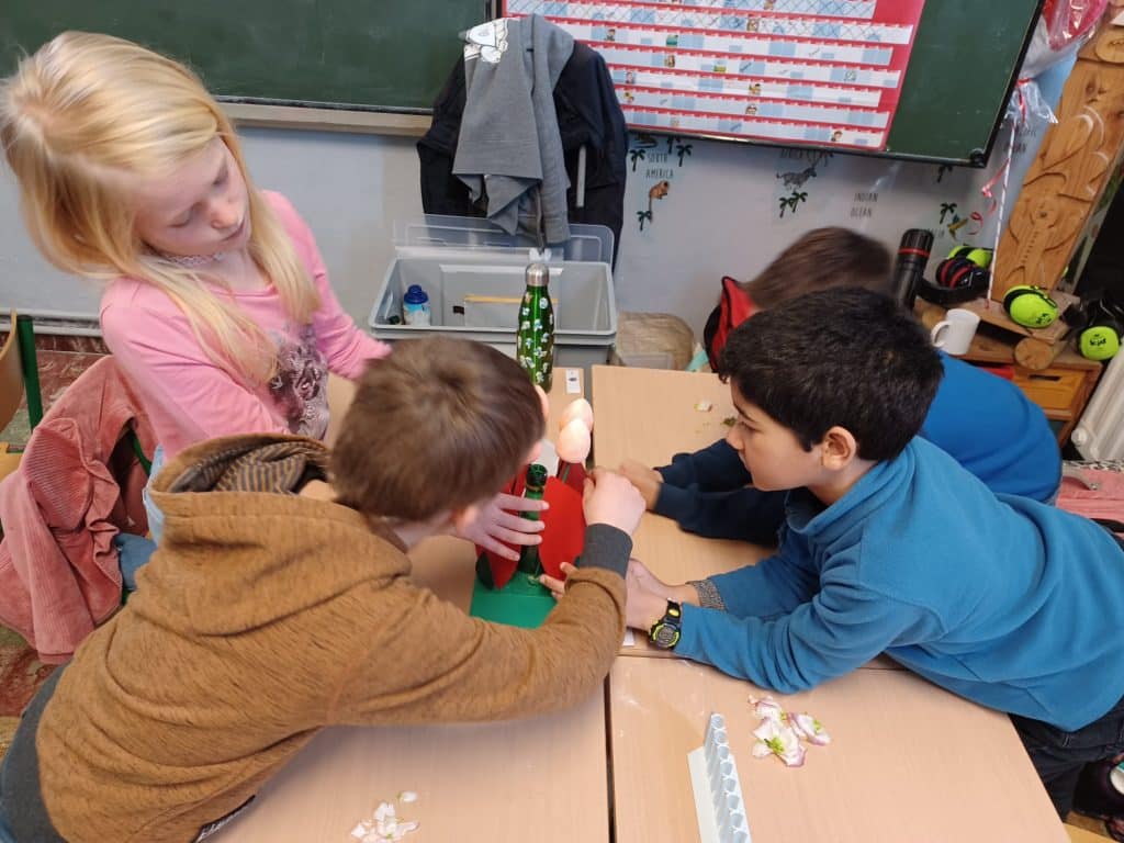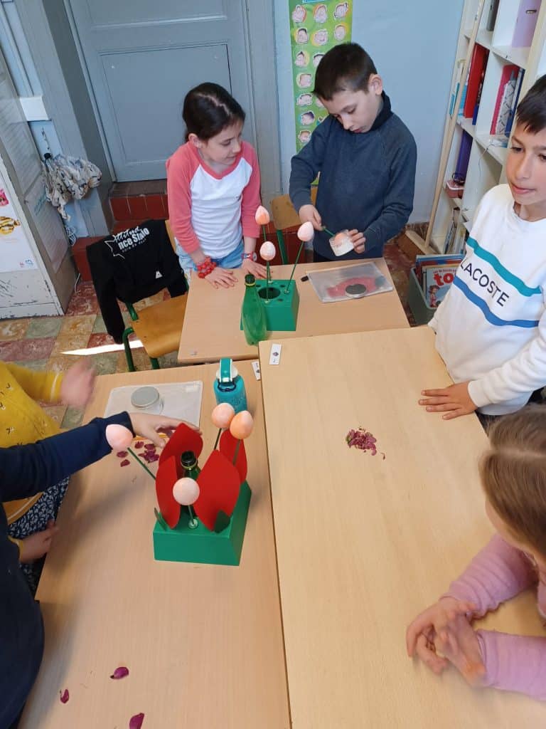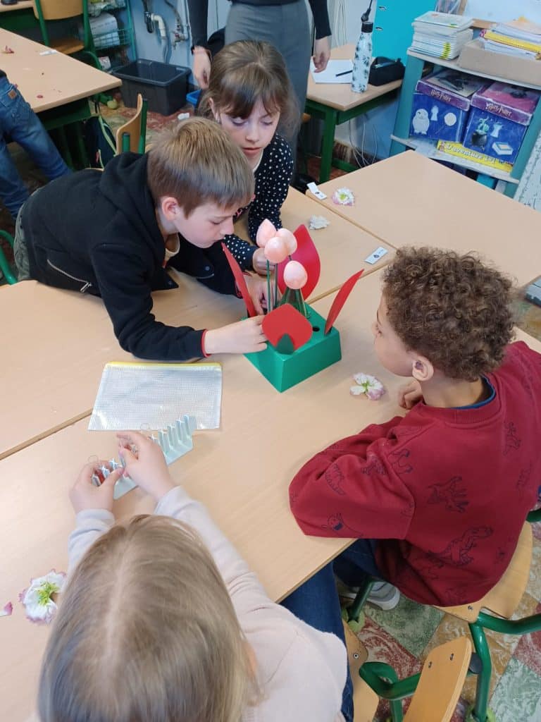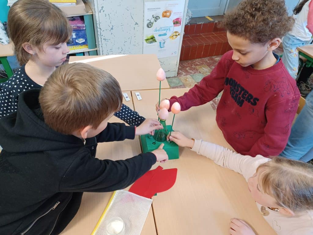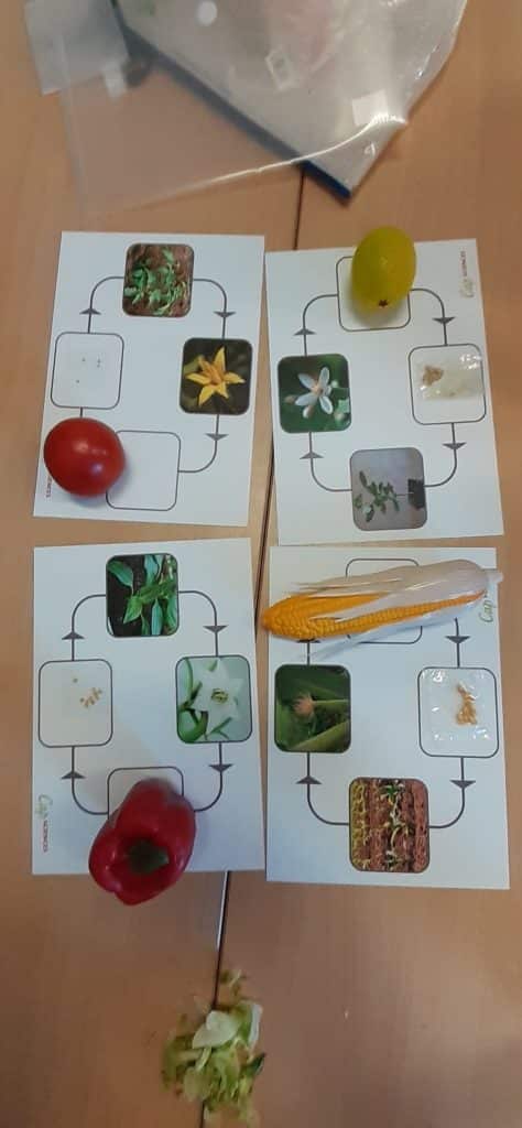 Les enfants ont découvert les différentes parties de la fleur, comment le pollen était transporté de fleur en fleur, ce qu’elles « devenaient » après, en quoi consiste le « travail » des abeilles, …