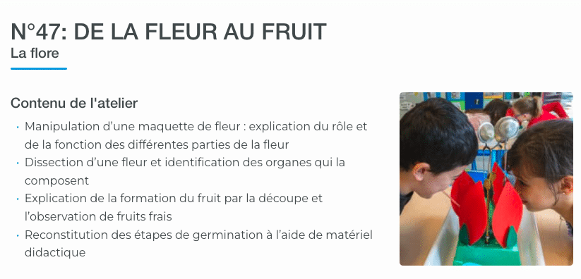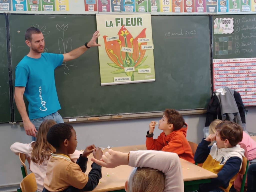 Cette activité était proposée par Cap SCIENCES et s’est tenue directement en classe. Elle s’est déroulée « comme une fleur » et semble avoir « porté ses fruits » puisqu’elle a permis aux élèves de répondre à un grand nombre de questions sur les organes qui composent une fleur, sur les différentes étapes de la germination, sur la formation d’un fruit