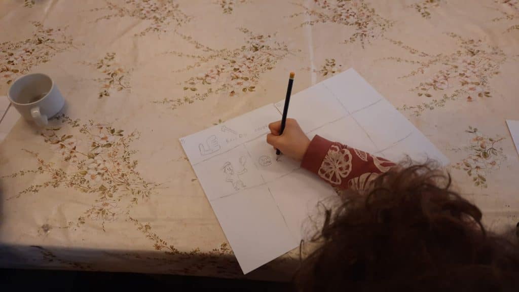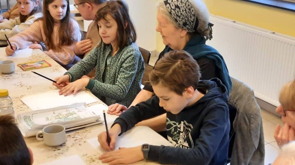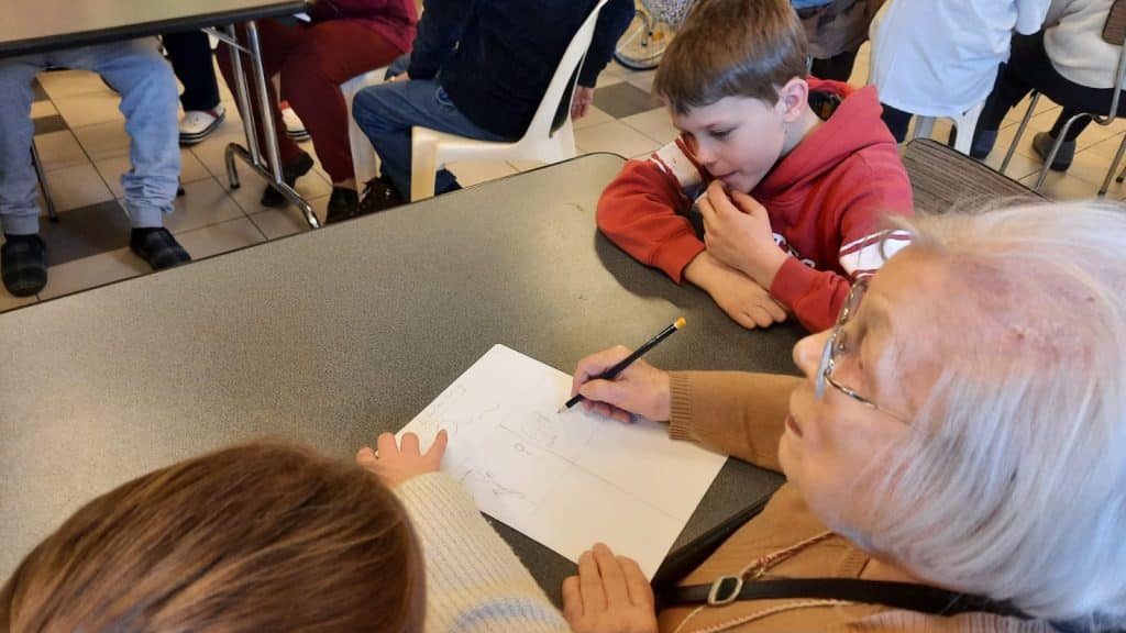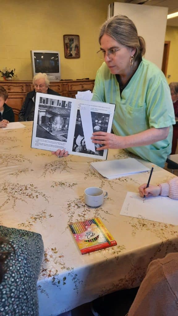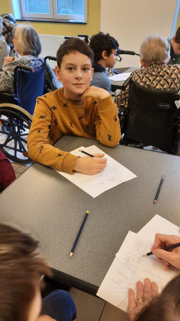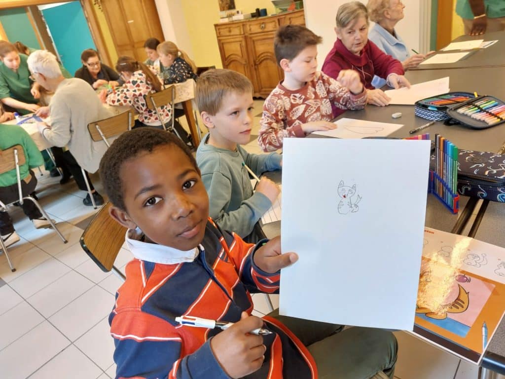De leur coté, le home avait choisi de faire des jeux de mimes et d’expression, de façon à créer un binôme enfant et personne âgée. Un des jeux proposé consistait à écouter l’ergothérapeute raconter une histoire et les enfants, en binôme avec une personne âgée, devaient dessiner ensemble les éléments de l’histoire.