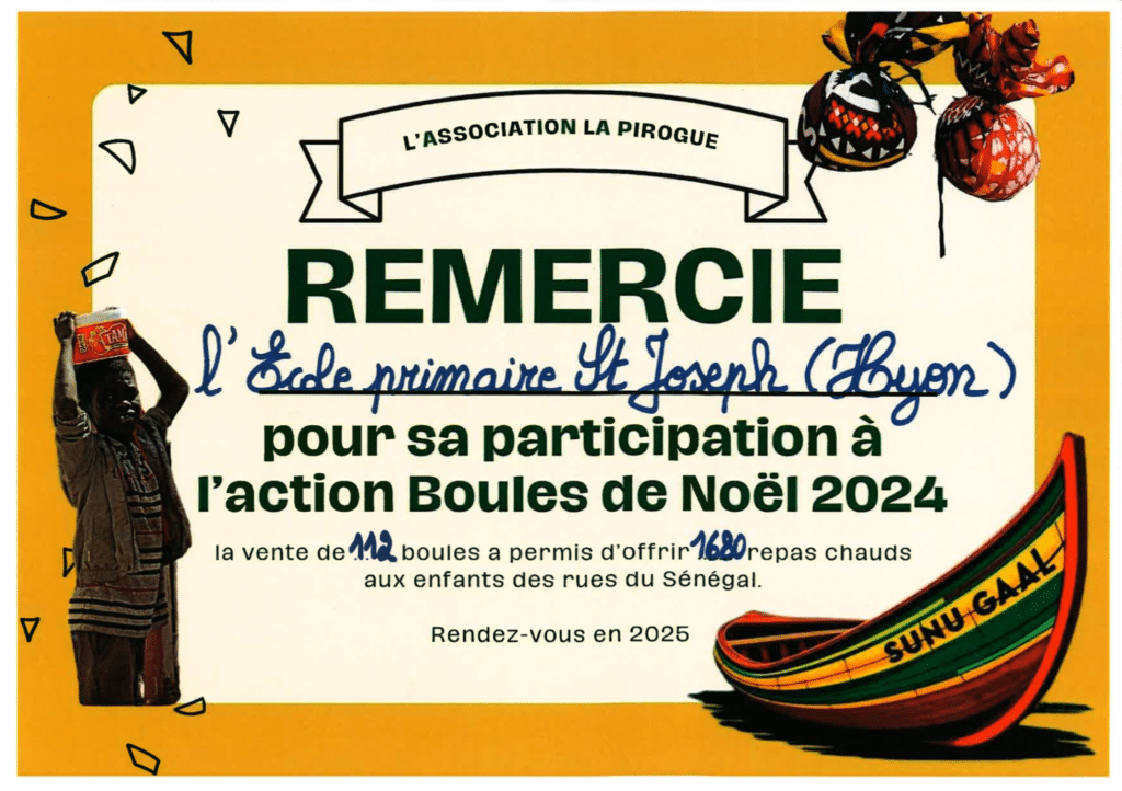 • L’opération Boules de Noël : En sortie de cette célébration, des boules de Noël décorées à la main ont été proposées à la vente pour soutenir l’association “La Pirogue”, qui vient en aide aux enfants des rues du Sénégal. Chaque boule à 5 euros a permis de financer 15 repas (15 x 2, car « petit déjeuner » + « dîner ») pour ces jeunes. Nous avons vendus une centaine de boules et offert ainsi 3000 repas à ces enfants !