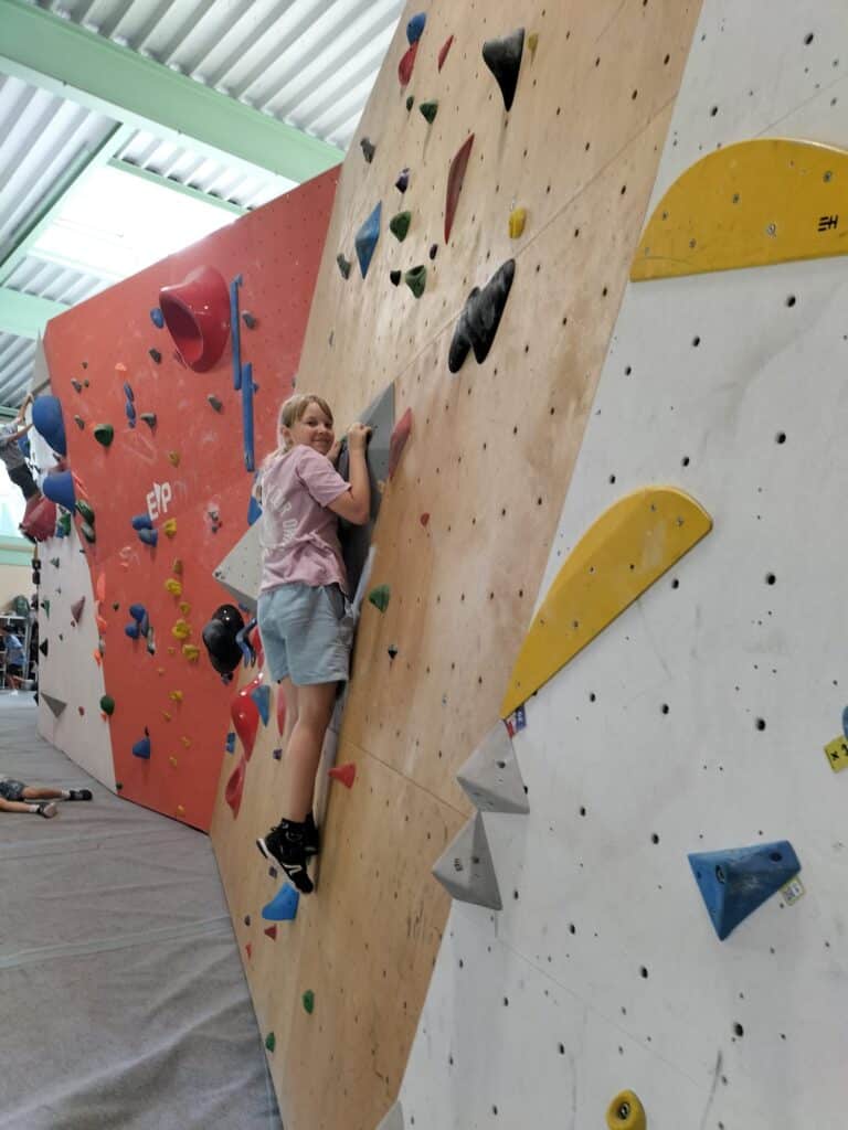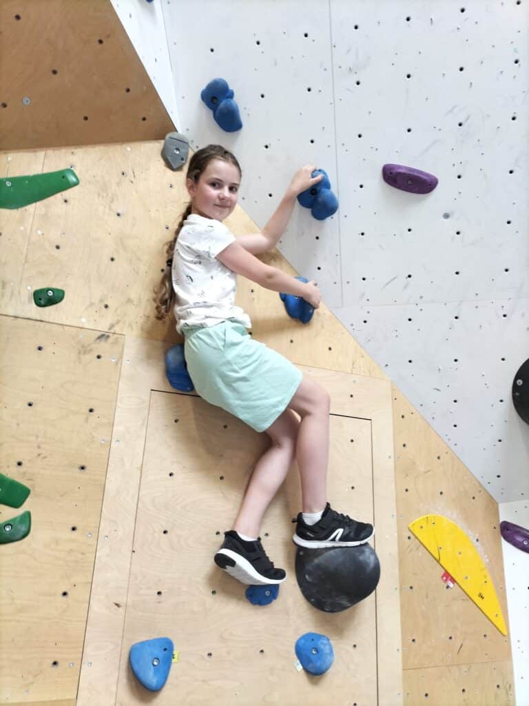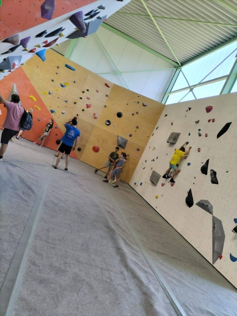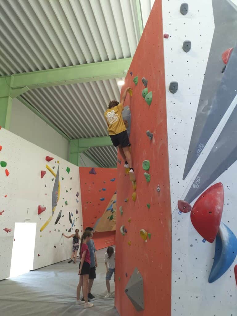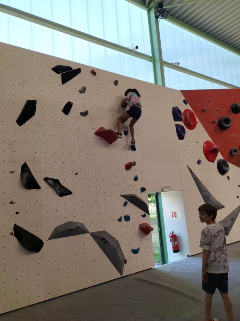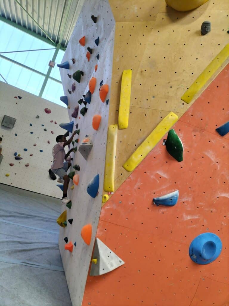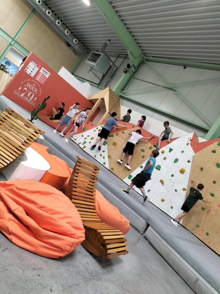 Après un pique-nique revigorant, place à l’escalade dans la salle de bloc du Dock 79, avec ses murs de 4,5 m et ses 800 m² de surface grimpable.
