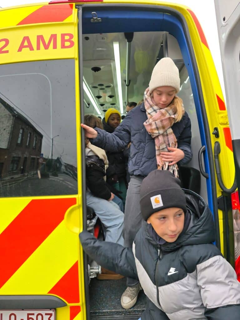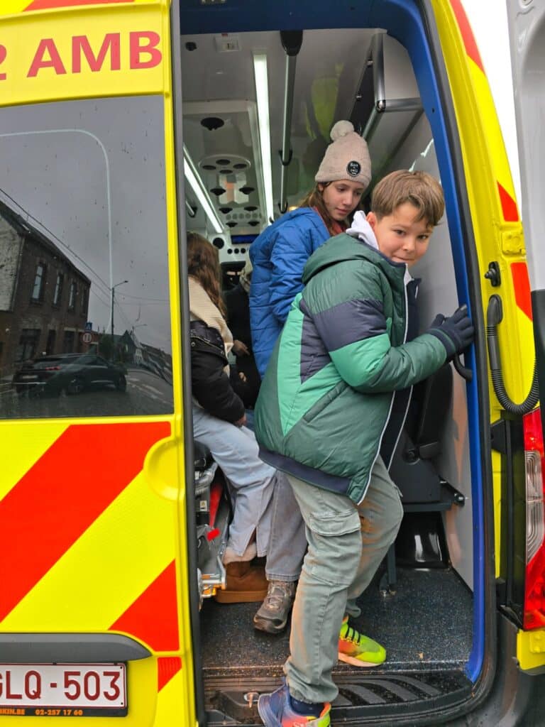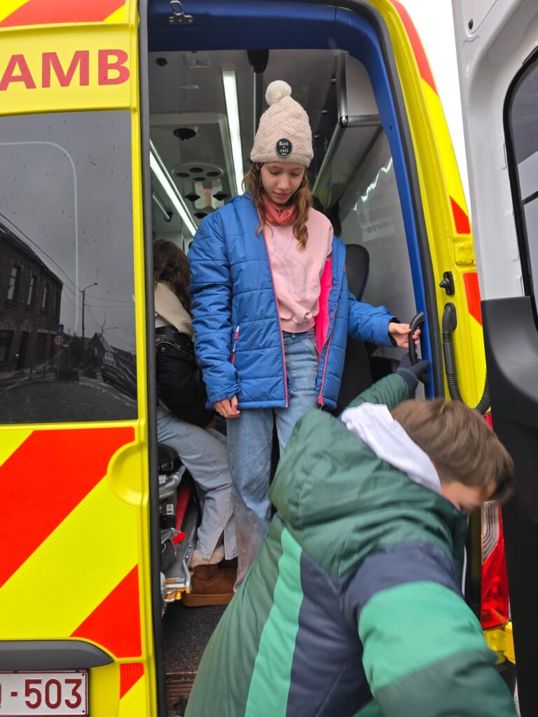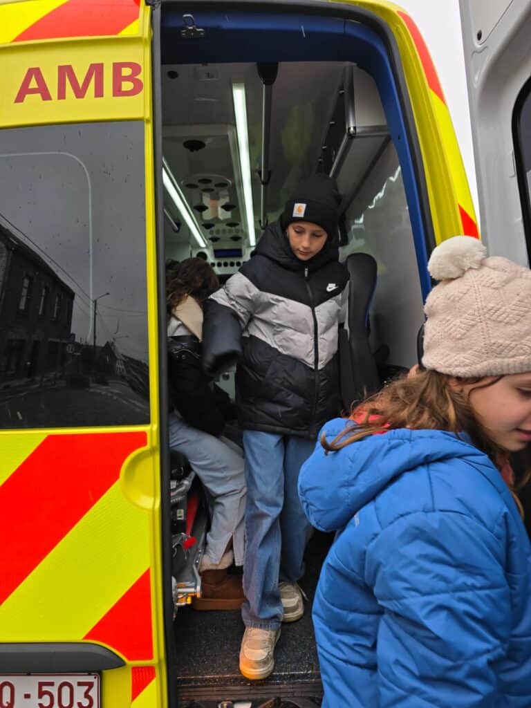 Le premier atelier proposait une immersion directe dans l’univers des secouristes. Les élèves ont pu monter dans l’ambulance, examiner le matériel médical, découvrir les instruments utilisés au quotidien et comprendre la mission des ambulanciers.