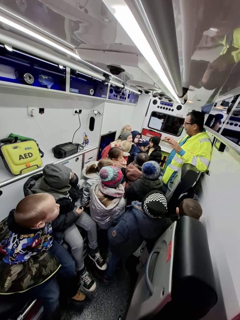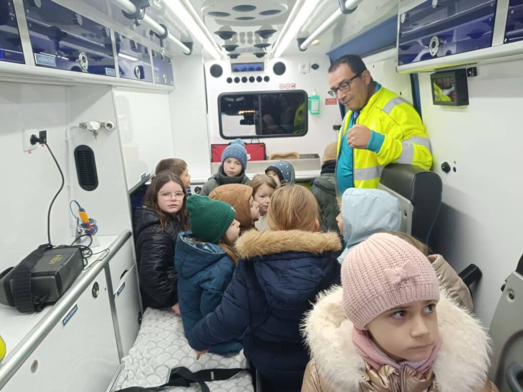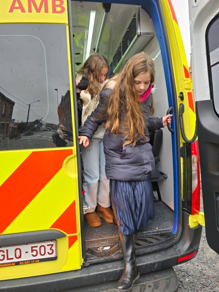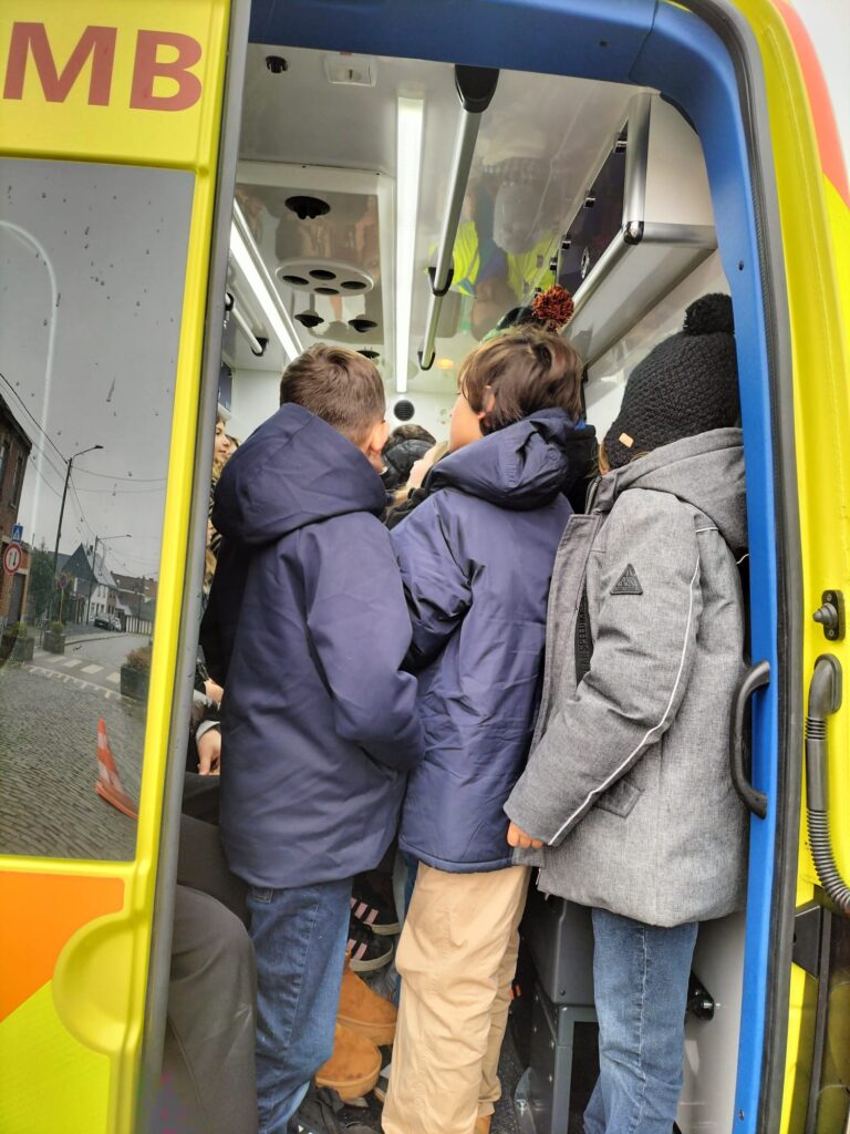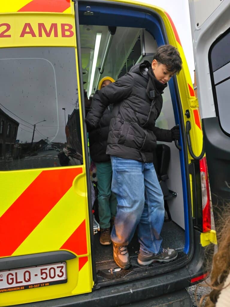 Le premier atelier proposait une immersion directe dans l’univers des secouristes. Les élèves ont pu monter dans l’ambulance, examiner le matériel médical, découvrir les instruments utilisés au quotidien et comprendre la mission des ambulanciers.